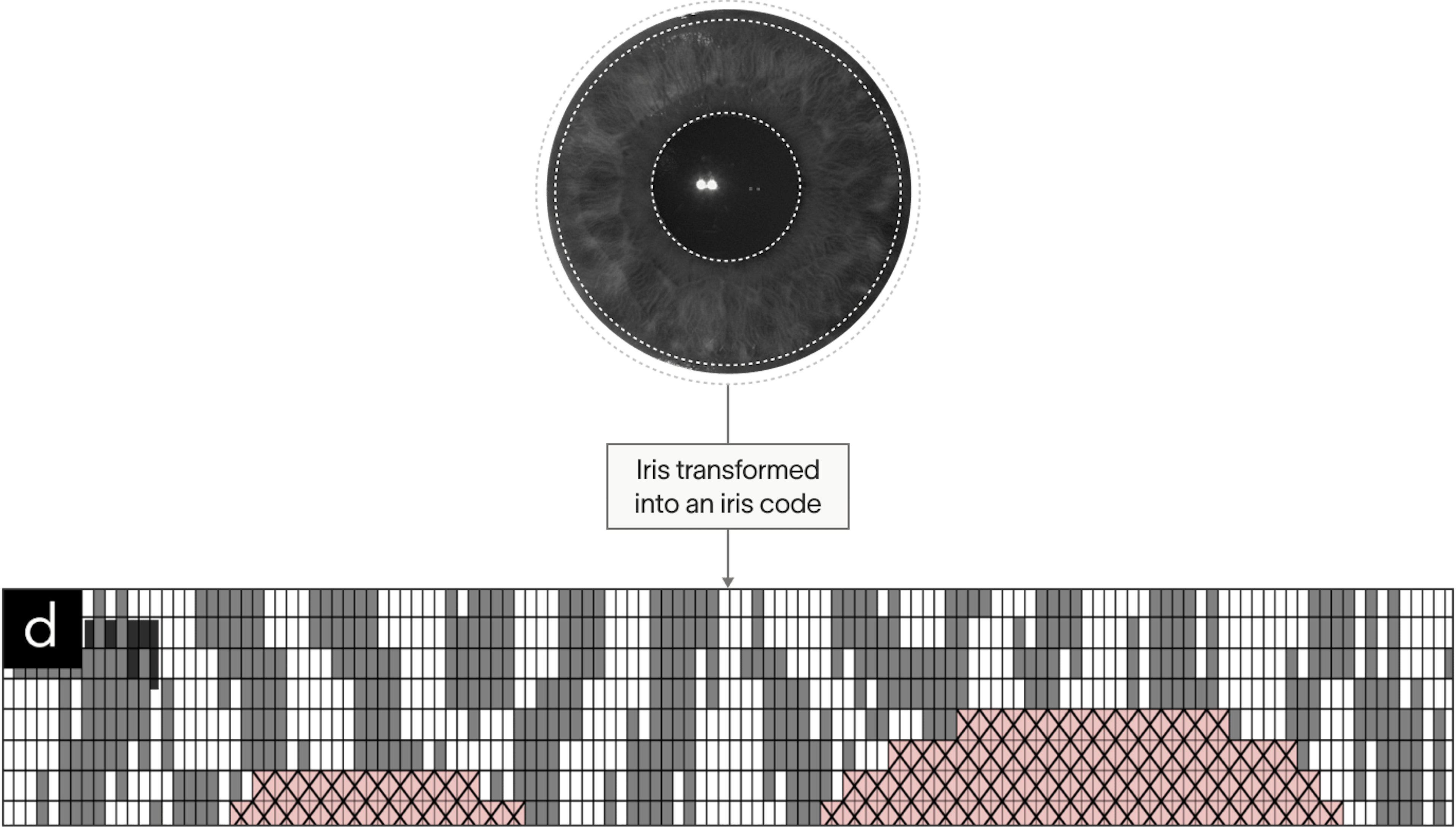 An example iris code is shown above. In red, a second array can be seen that represents the mask applied to the image, these are pixels of the image that don't represent part of the iris texture, like eyelids, which are of course ignored when computing the Hamming distance between irises.