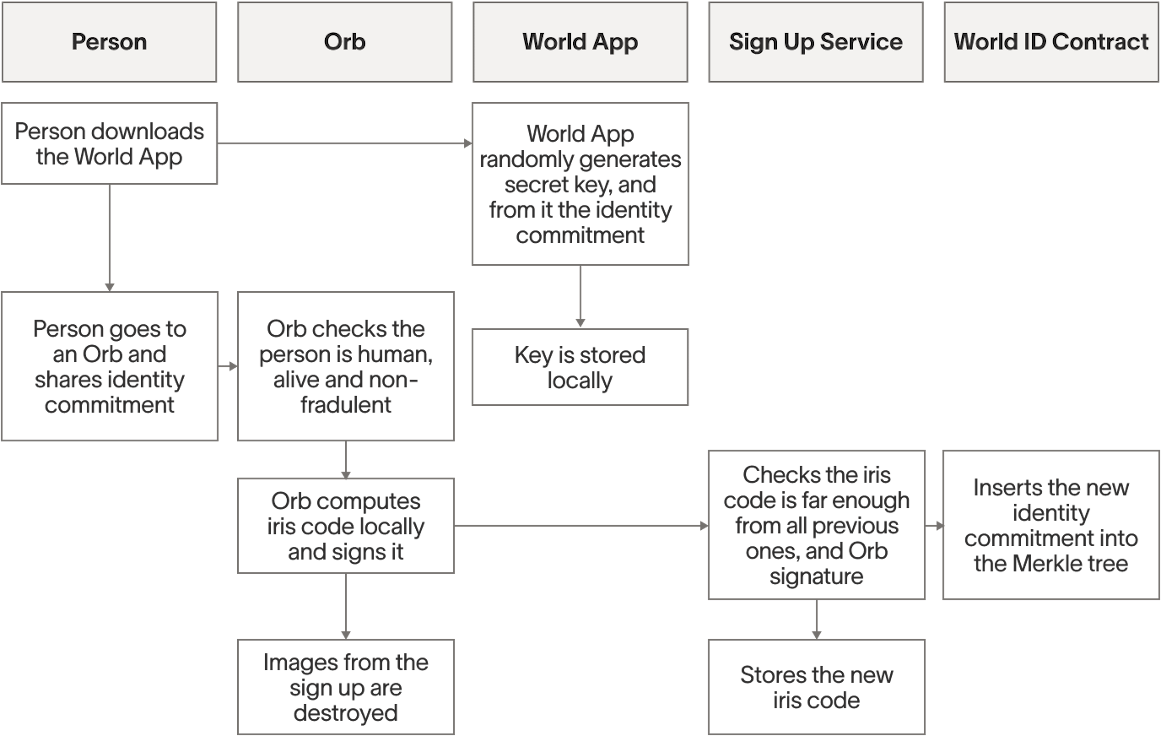 - User downloads the World App. The app generates two cryptographically-secure random private keys, one is for the user's World ID, one for the user's crypto wallet. Keys are generated in the user's device using randomness from the device. To make it very clear, both private keys are randomly generated, completely independent of any biometric information, and each other. In fact, keys are generated before the Orb is involved.
