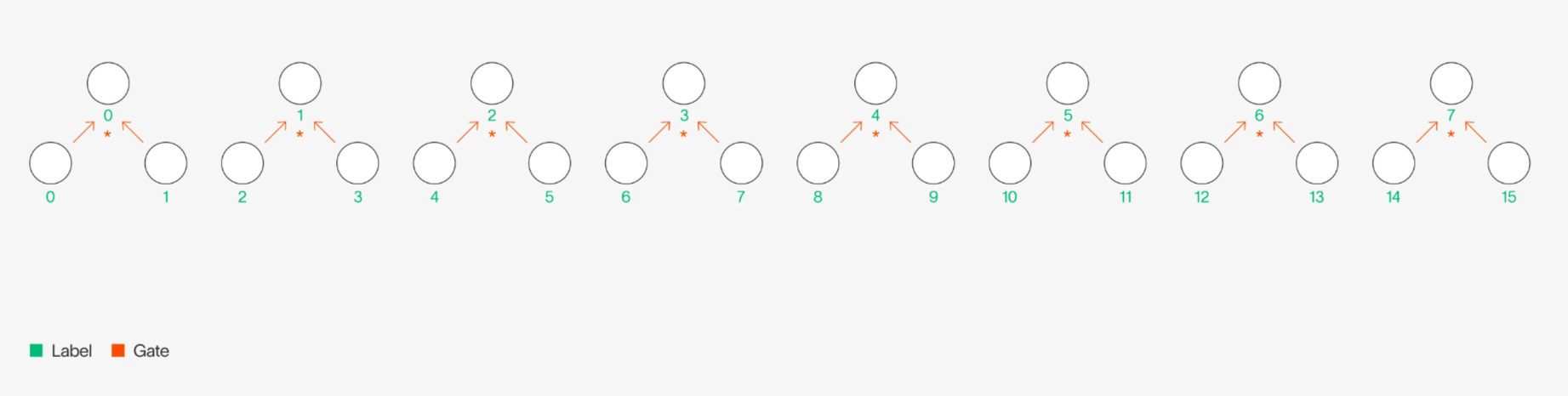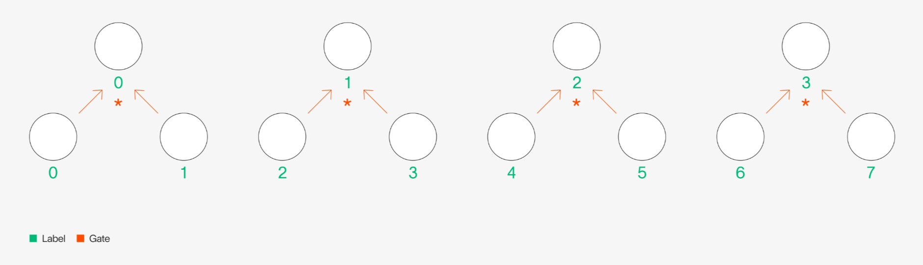 The more common style of GKR computation in literature is to use gates—where we define output of a computation using binary gates that dictate how to combine values in a previous computation. For example, if we want to add every other pair of values in a layer and multiply the remaining pairs of values in that same layer to result in the output of the next layer, we could define this computation using and binary gates: